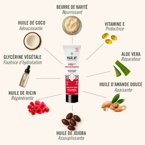 Après avoir éliminé les callosités avec la lotion Marlay, appliquez la Crème Marlay Hydra++ chaque soir pour une action réparatrice durant la nuit. Enrichie en beurre de karité et en jojoba, elle nourrit et répare intensément la peau, l’aloe vera l’hydrate en profondeur, et l’huile d’amande douce l’adoucit et l’assouplit lui offrant un toucher velours.