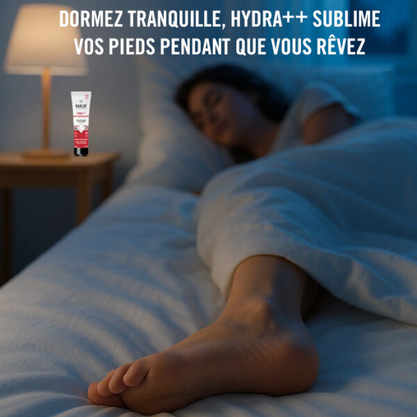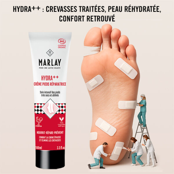 La crème pieds Marlay Hydra++ nourrit et répare la peau en profondeur dès la première application pendant 24 heures. Elle élimine rapidement les crevasses et prévient la formation de corne dure et épaisse, pour des pieds plus doux et lisses jour après jour.