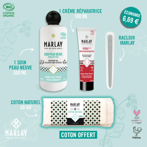 Le kit contient : 1 lotion Soin Peau Neuve 500 ml + 1 Crème pieds réparatrice Hydra++ 100 ml + 1 racloir Marlay + coton naturel OFFERT